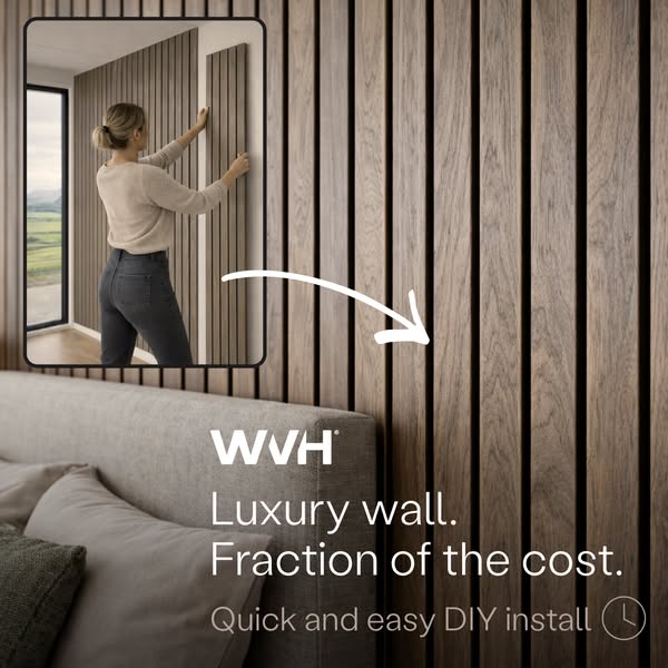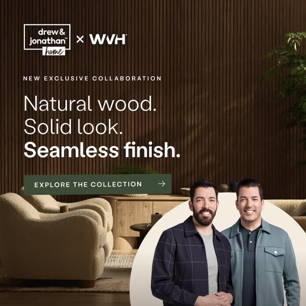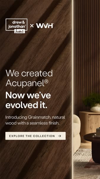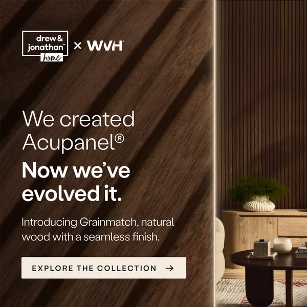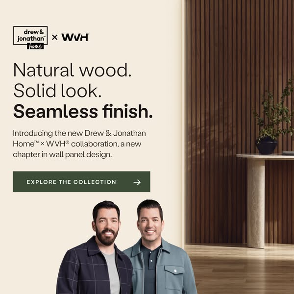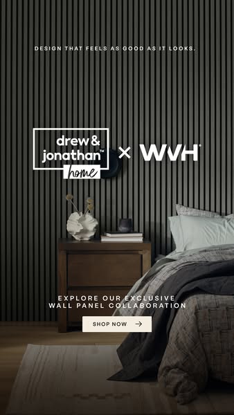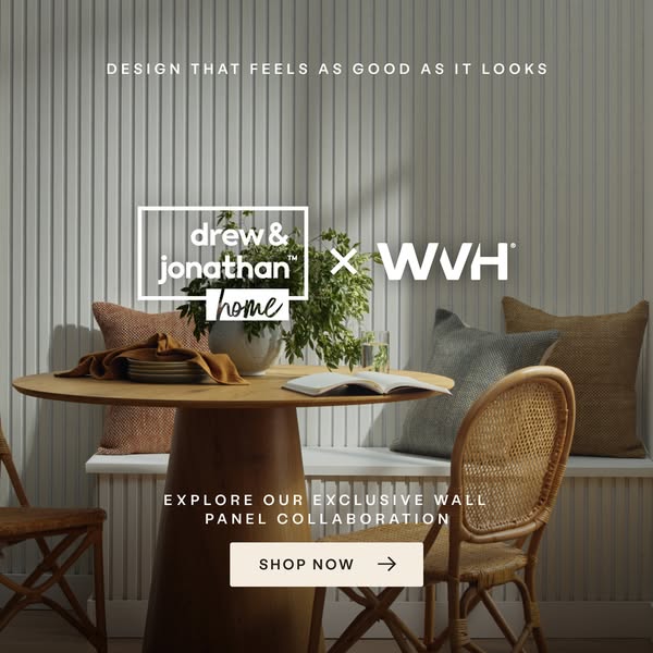 Where design meets innovation. Introducing the Drew & Jonathan Home™ x WVH® collaboration, a new chapter in wall panel design. Each Grainmatch panel features natural wood veneer slats on a colour-matc